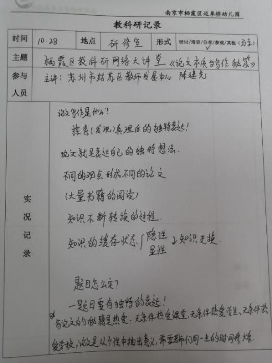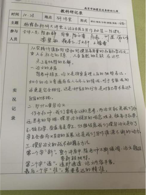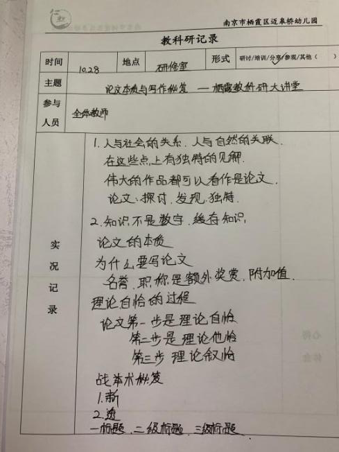 今天中午,全园骨干教师参与了此次《论文本质与写作秘籍》的学习并且撰写了笔记和读书心得。在教研活动中,谢主任带领大家解读了论文选题的“新”、论文内容的“透”、论文表达的“准”。论文题材应该是源于实践、最后落入实践问题的探讨与解决。
