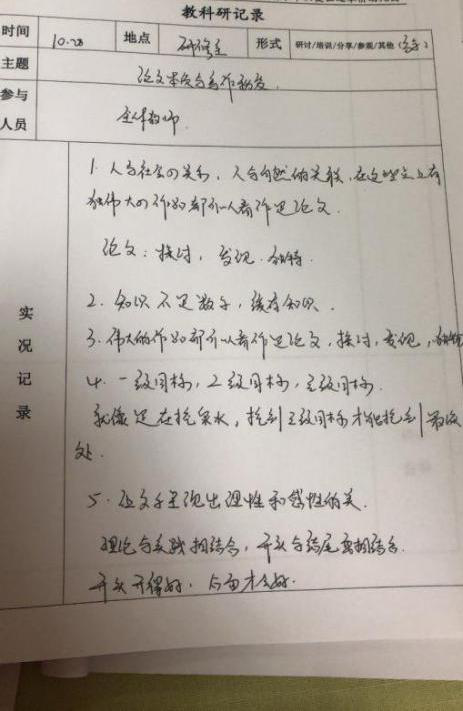 在讲到理论部分一定要扣题,“横要到边,纵要到底”研究思路要清晰。题目选定了,我们就围绕论文进行深入的论述。所以当我们教师在写作论文时要结合自己教育,要做到持续关注。论据要充分。重在论证。我们的论文才显得与众不同,论点才能站得住脚。正如陈老师最后结束时所说,论文一定要做到三个有,这样才会写出优秀的论文。